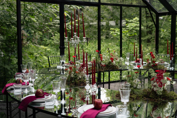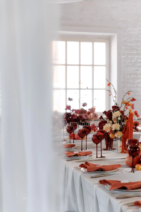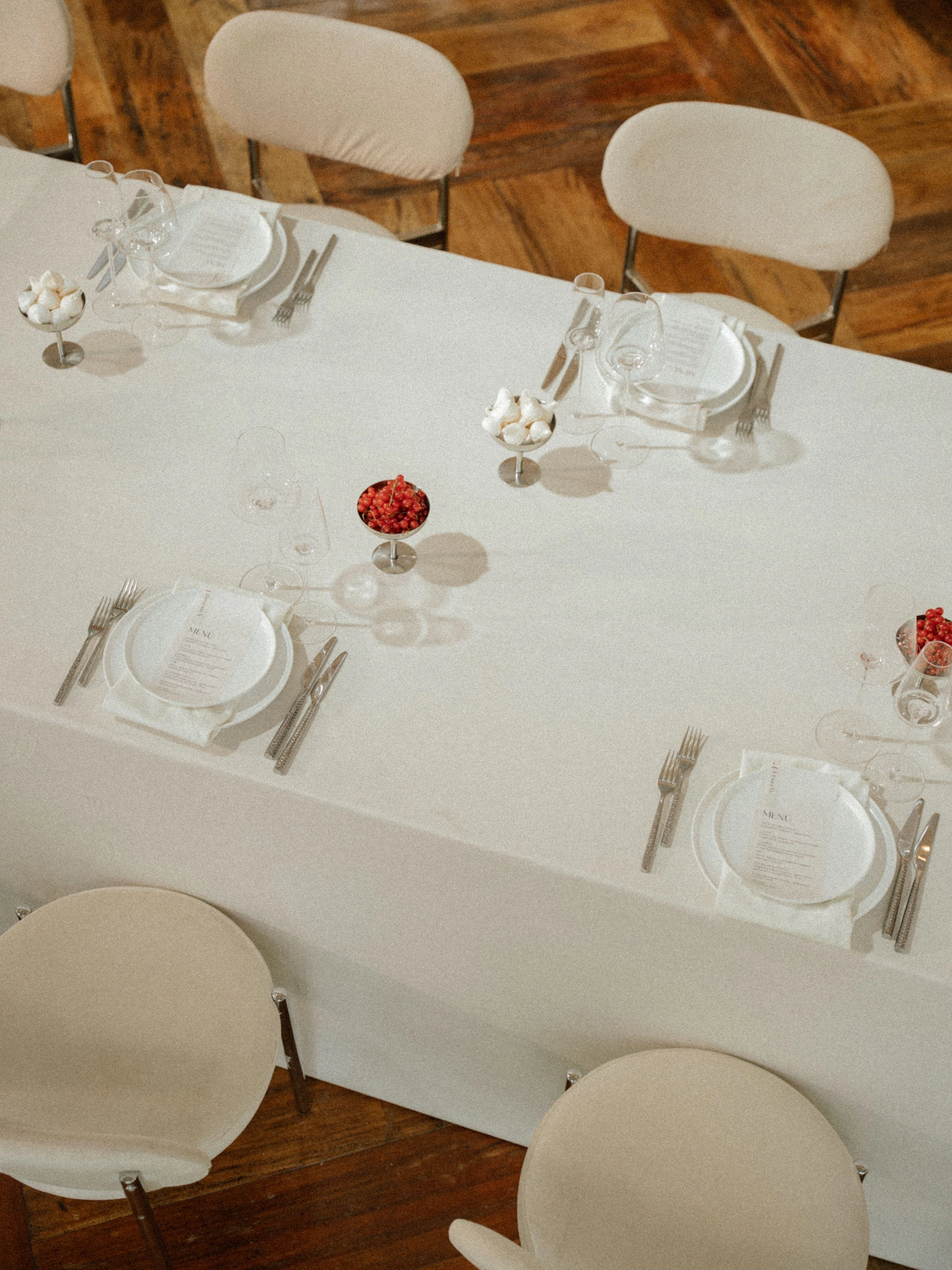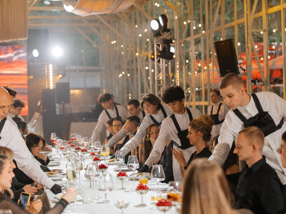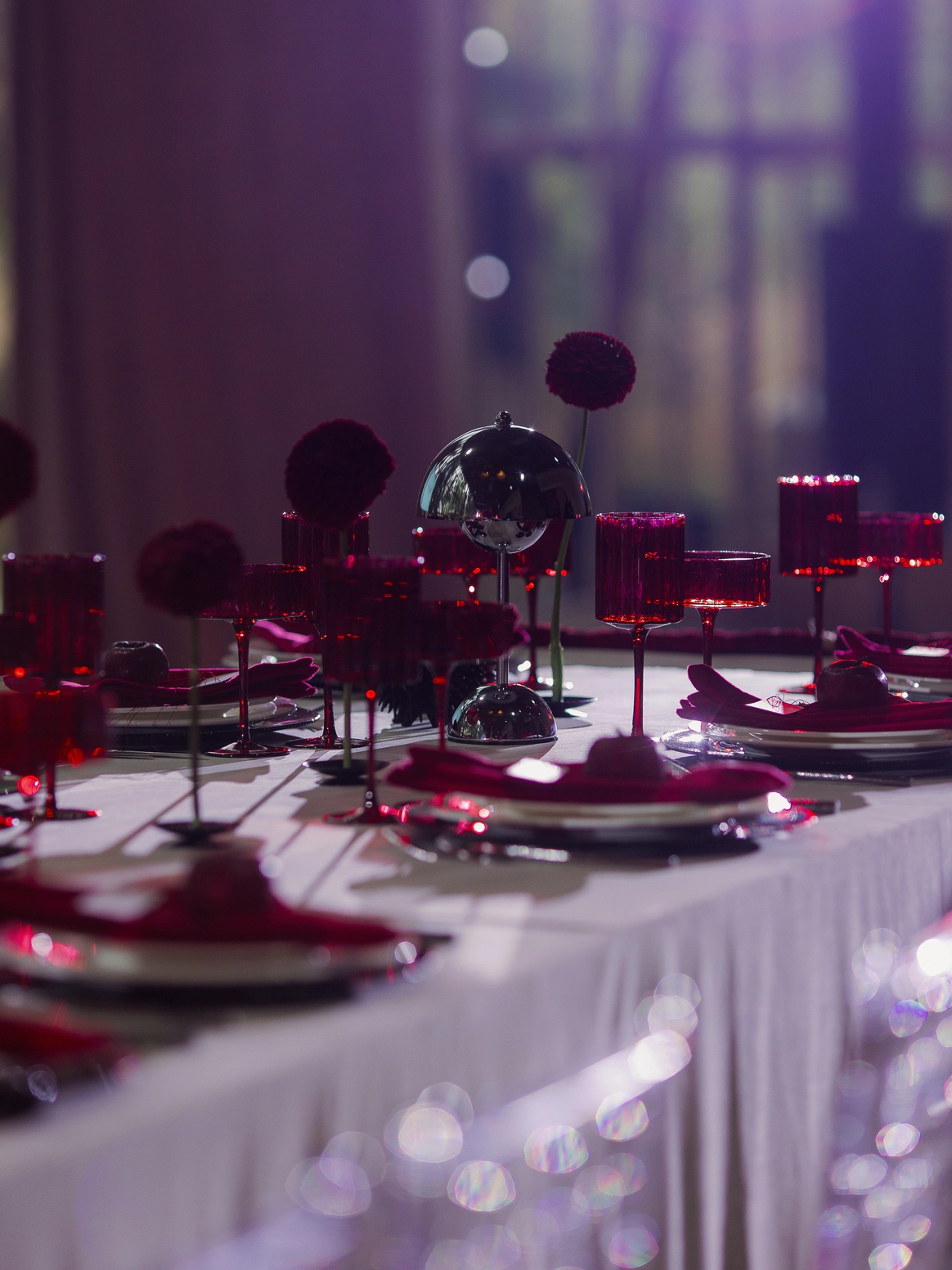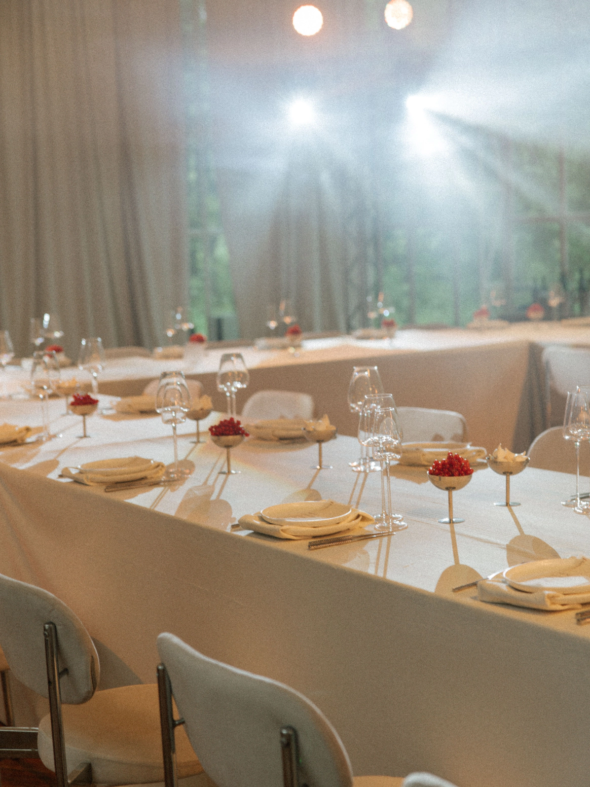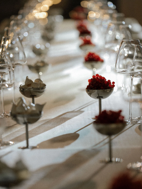 В интерьере зала мы использовали сдержанный, чистый, но с изюминкой декор. Светлые бархатные скатерти служили фоном для дорогой сервировки. А безе и красная смородина возвращала нас к контрасту и многогранности пары. Для сохранения акцента на декоре мы выбрали курсовую подачу блюд.
