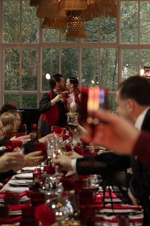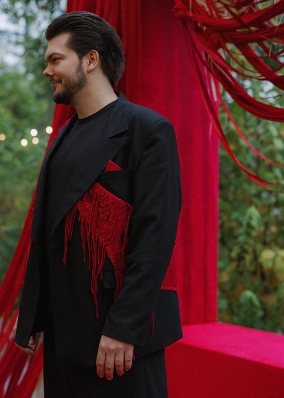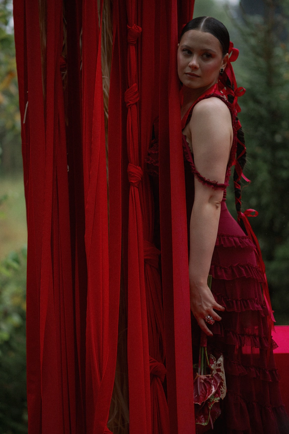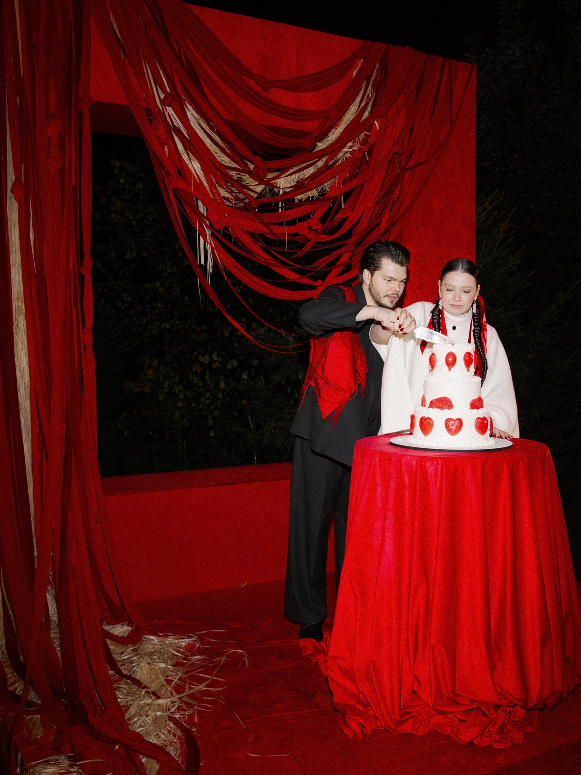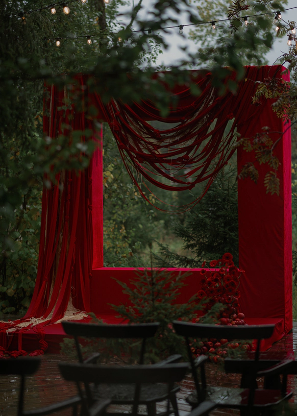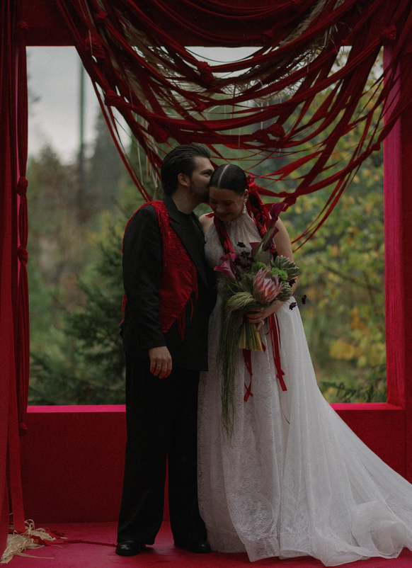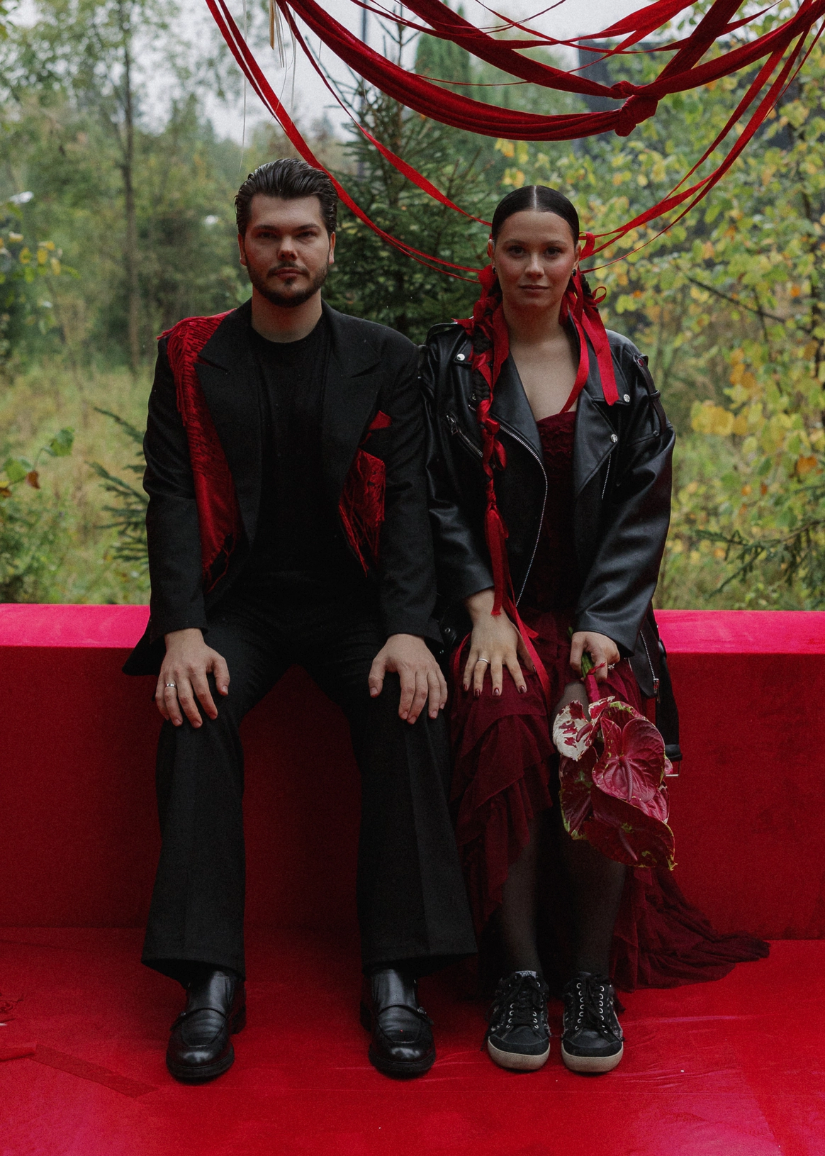 Важной частью проекта стали образы пары. У невесты было несколько образов, дополненных длинными косами с красными прядями. Образ жениха был создан по индивидуальному пошиву - черный костюм с красными вставками с кисеей. Образы поддерживали общую концепцию и подчёркивали личный характер пары.