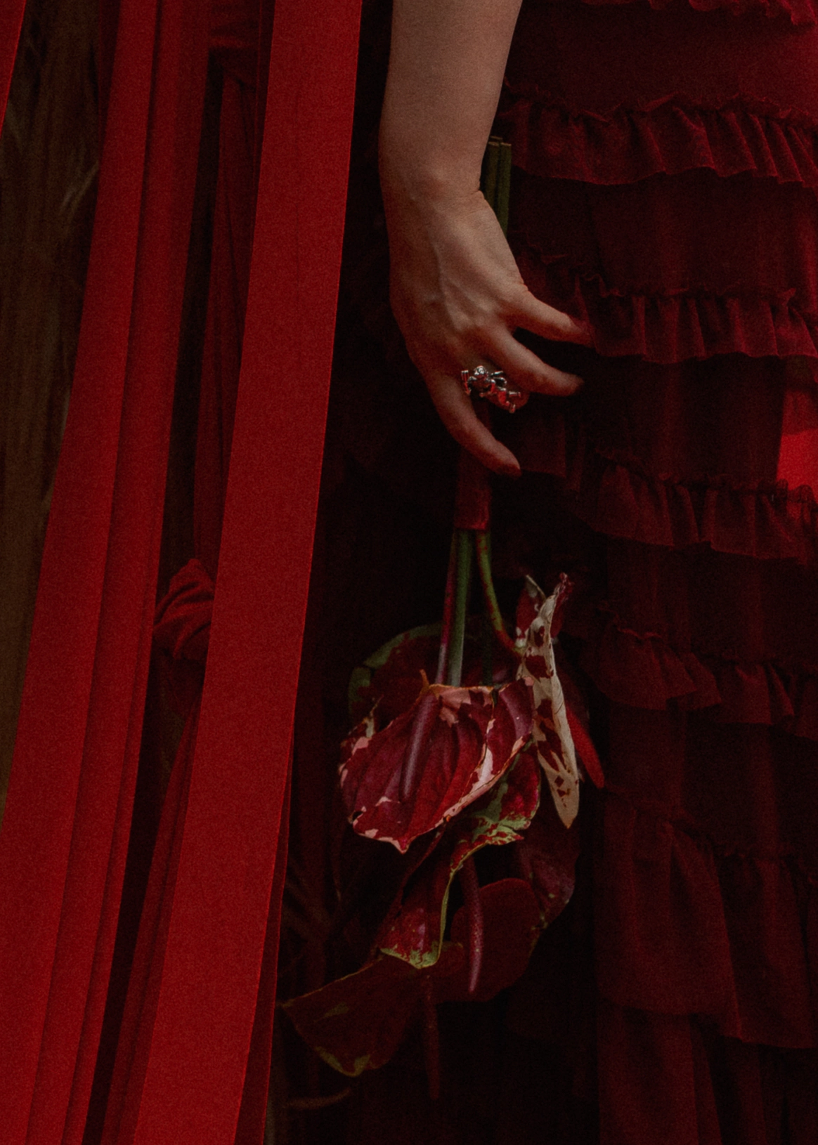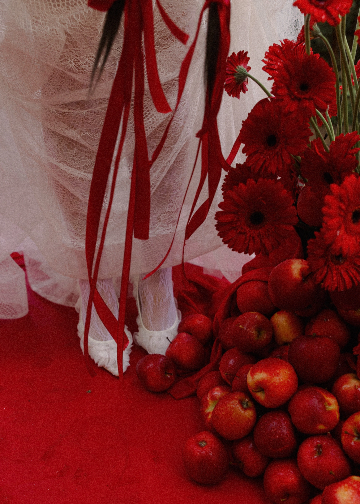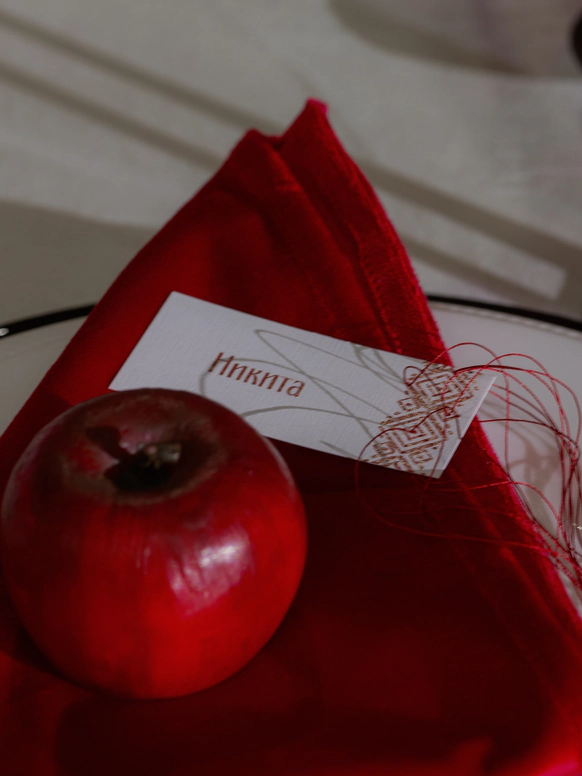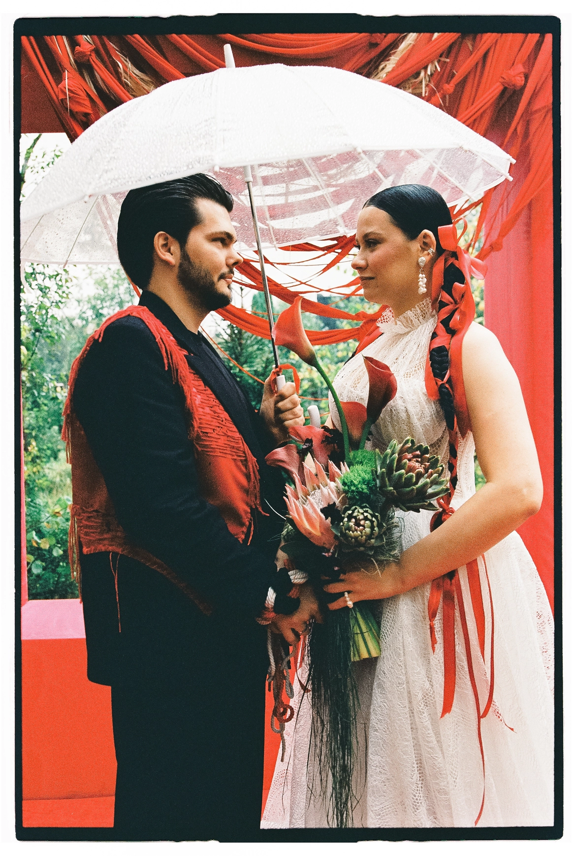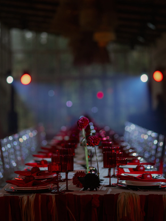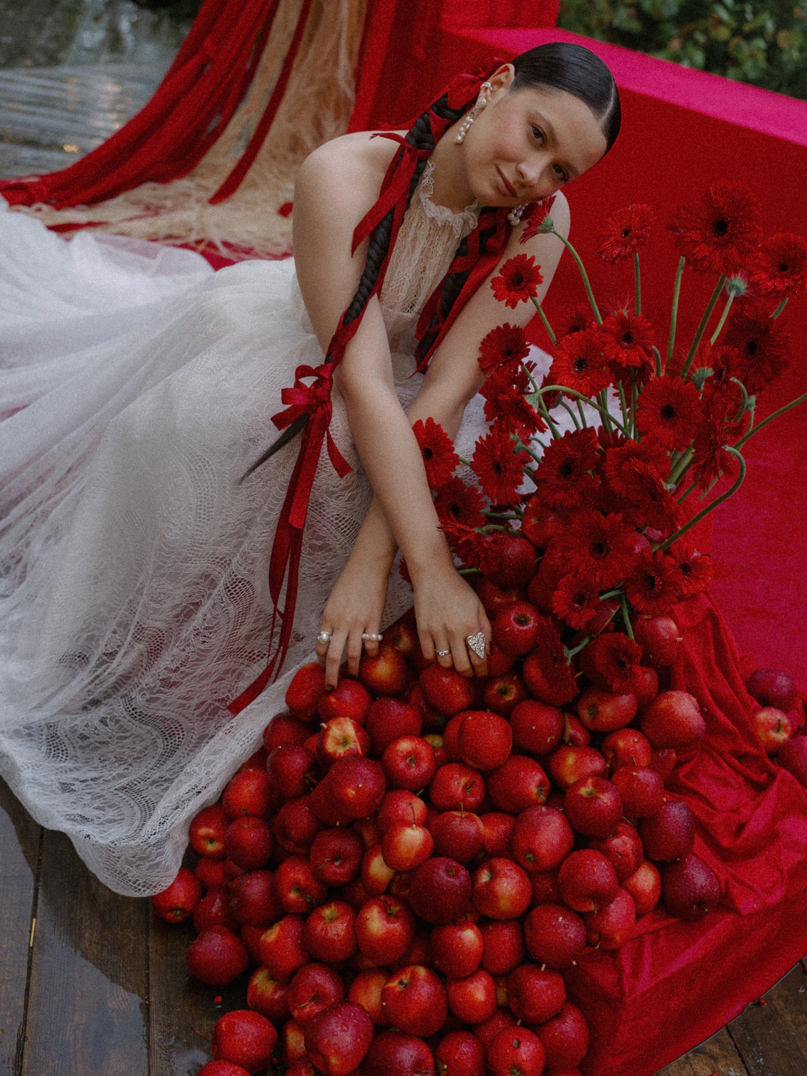 Важной частью проекта стали образы пары. У невесты было несколько образов, дополненных длинными косами с красными прядями. Образ жениха был создан по индивидуальному пошиву - черный костюм с красными вставками с кисеей. Образы поддерживали общую концепцию и подчёркивали личный характер пары.