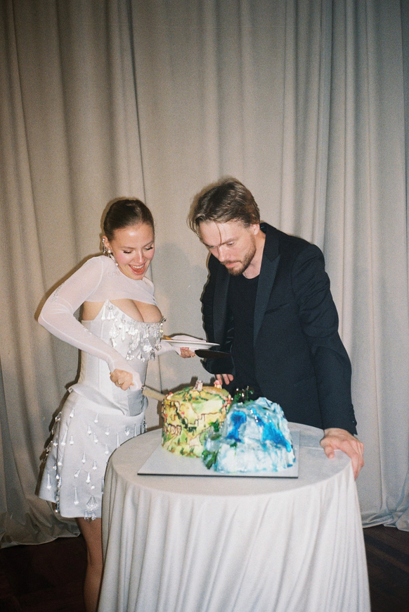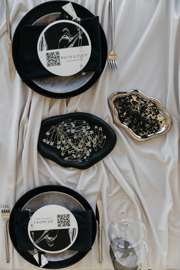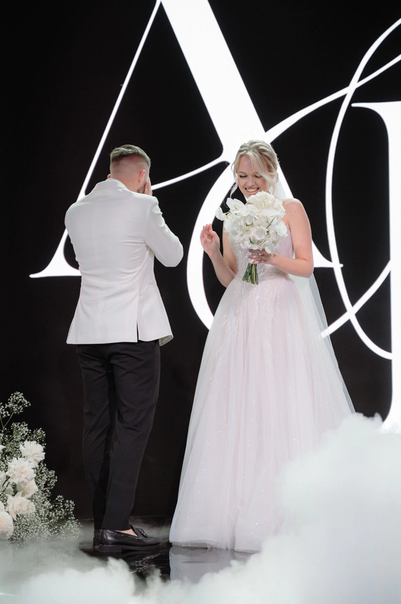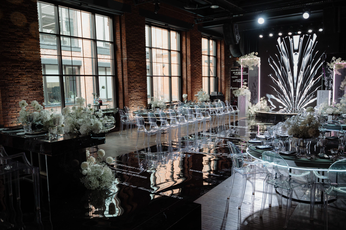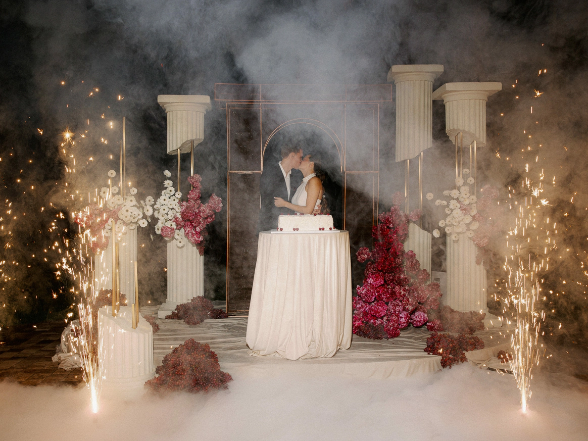 Несмотря на сдержанный welcome и дресс-код blaсk tie, в начале вечера гостей встречал иллюзионист с "неудачными" фокусами - опять возвращая нас к контрастам. Кавер-группа - это особая любовь, которая случилась в одном из путешествий пары в Нижний Новгород. Вечер завершили бар с авторскими коктейлями и нестандартный торт-арт-объект на стыке фэнтези и сюрреализма, который пара впервые увидела вместе с гостями.