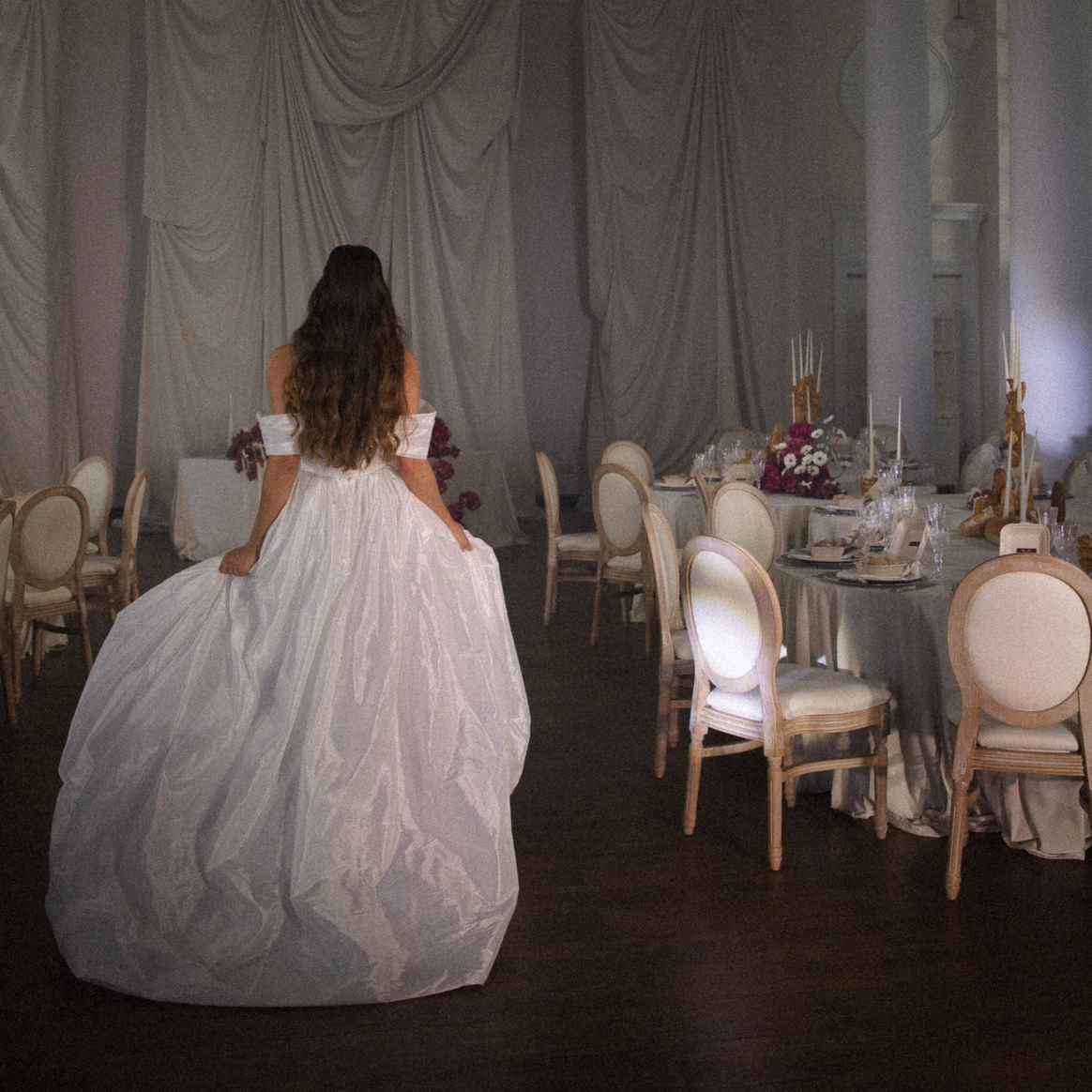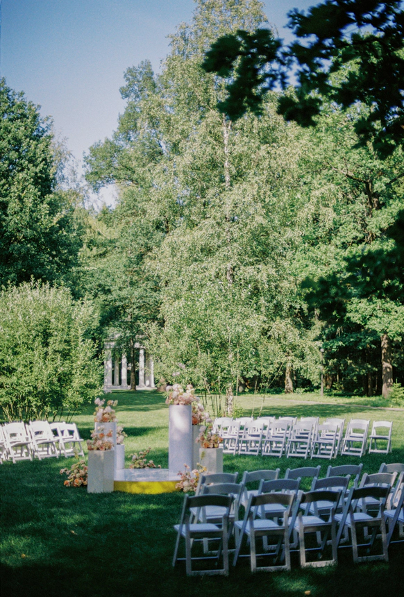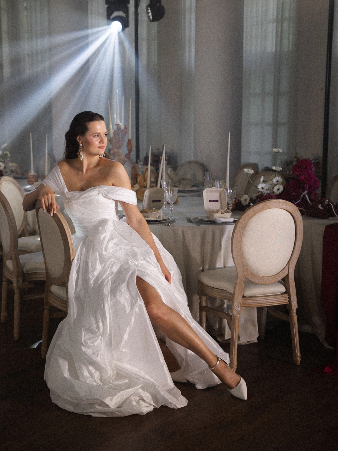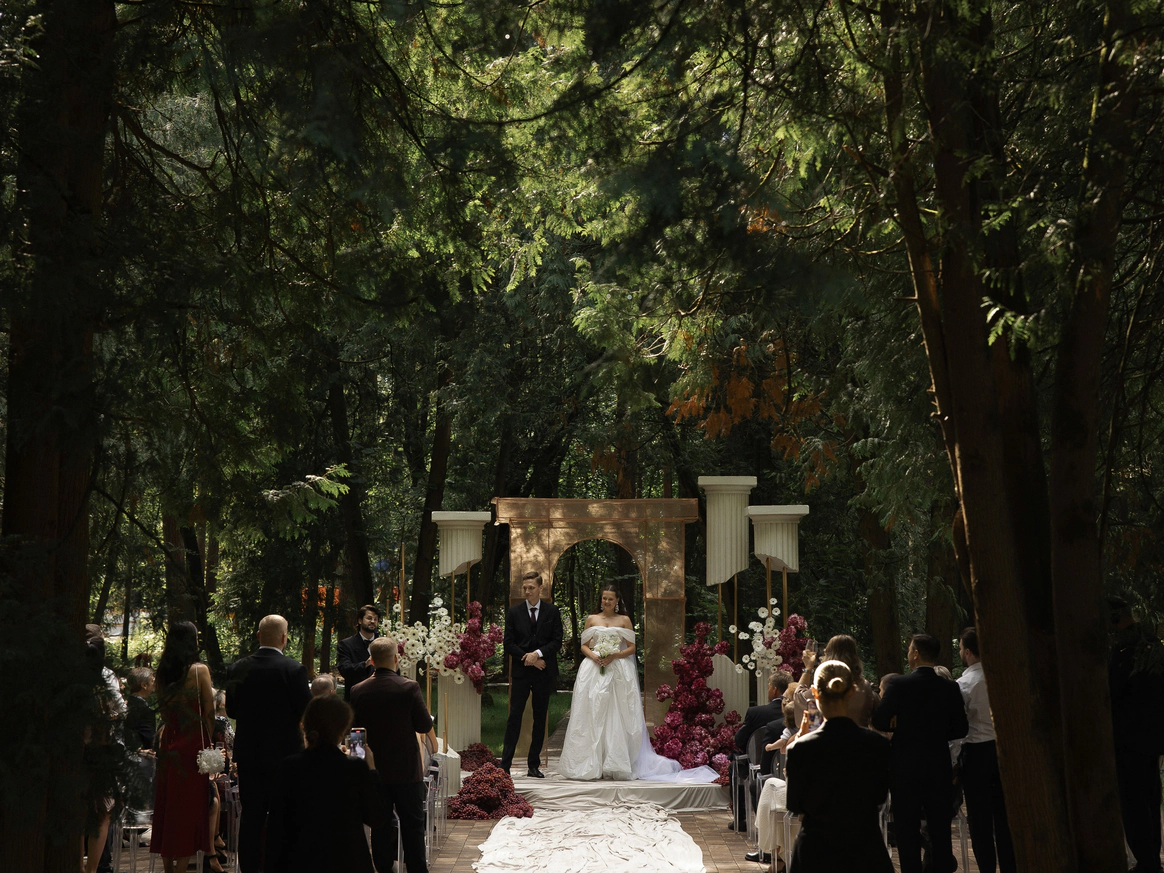 Мы решили остановиться на площадке Вилла Политика - усадьба с выразительной архитектурой и колоннами, которая полностью соответствовала визуальному запросу пары. Архитектура пространства задала направление всему визуальному решению. Цветовая палитра строилась на пудрово-бежевых оттенках с флористическим бордовым акцентом.