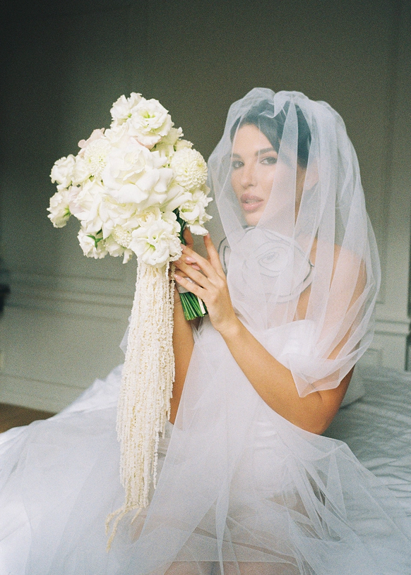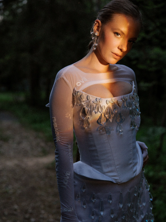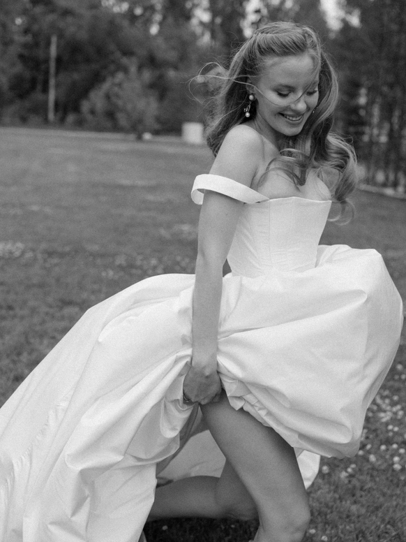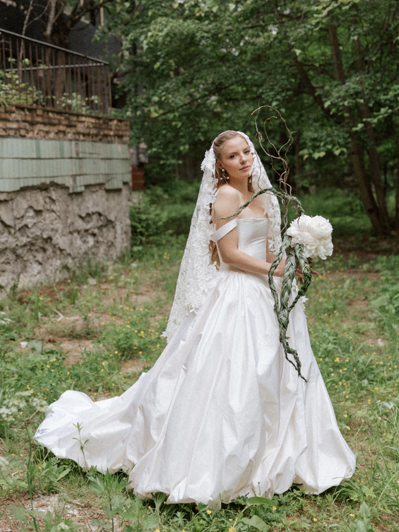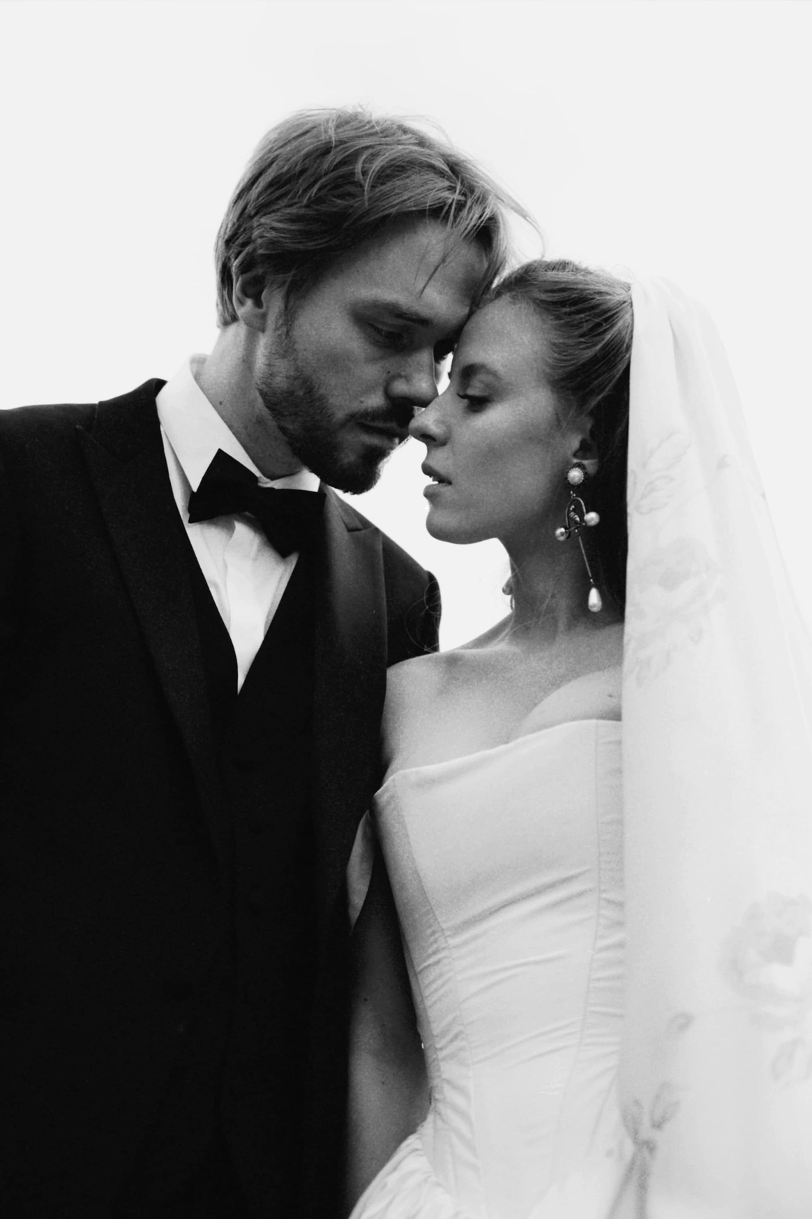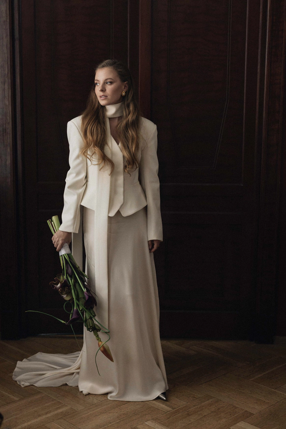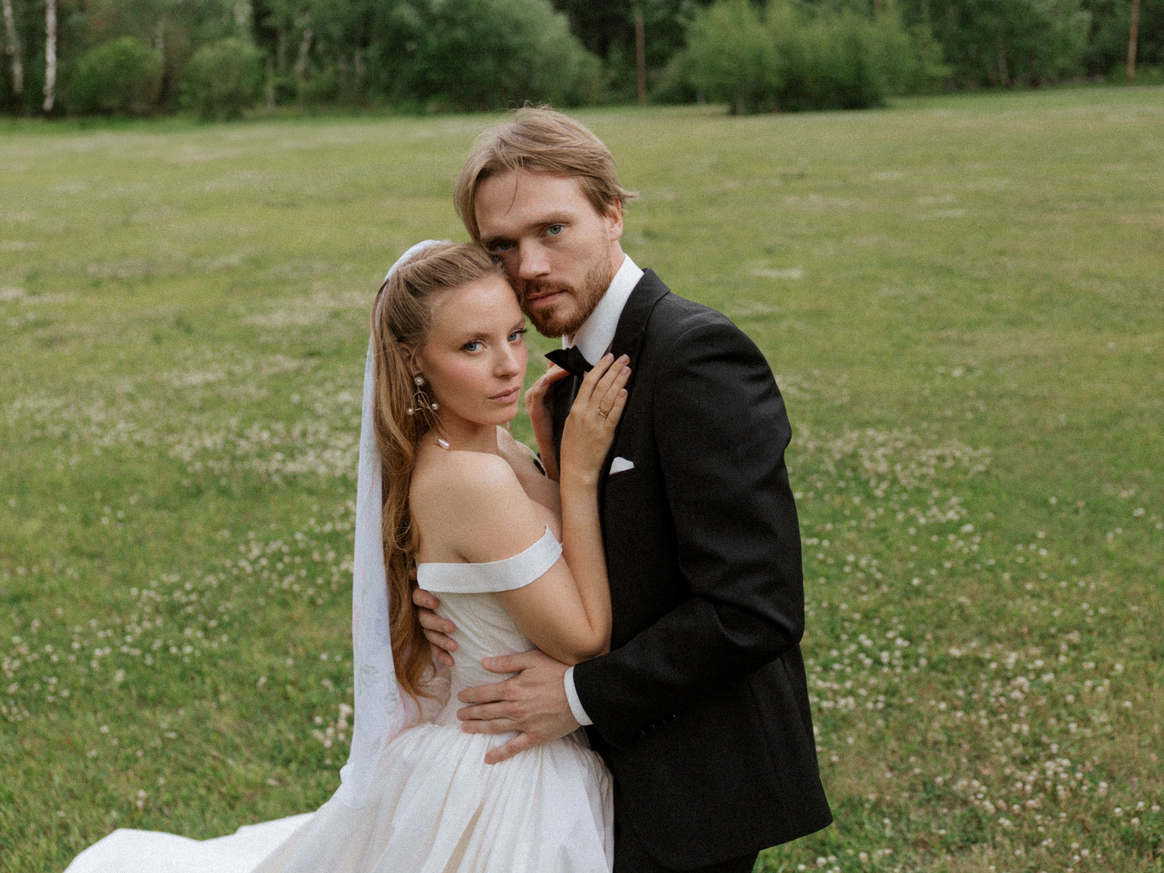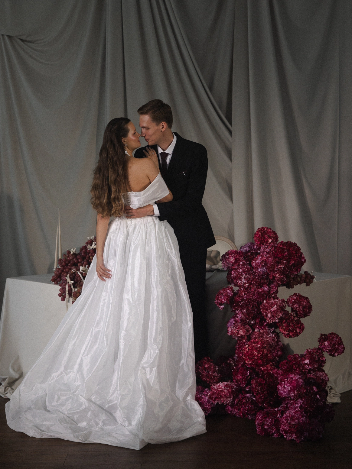 А в основной день было реализовано три образа невесты: утренний - лёгкий и воздушный, основной - многогранный и доносящий смыслы, сочетающий классическое платье и уникальный «таинственный букет из заброшенного сада» и финальный - сюрприз от стилиста, отражающий то, как невесту видят окружающие, дополненный вышивкой со значимыми для пары словами. Для жениха был выбран классический смокинг - дорого и стильно.