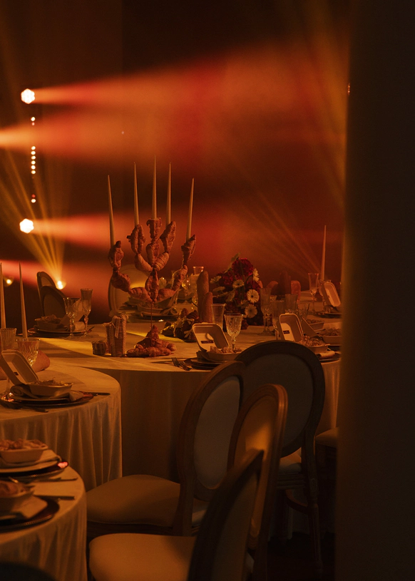 Свет играл важную роль в создании уюта и настроения. Тёплое освещение подчёркивало архитектуру зала, декор и флористику, помогая сделать большое пространство более тёплым и домашним.