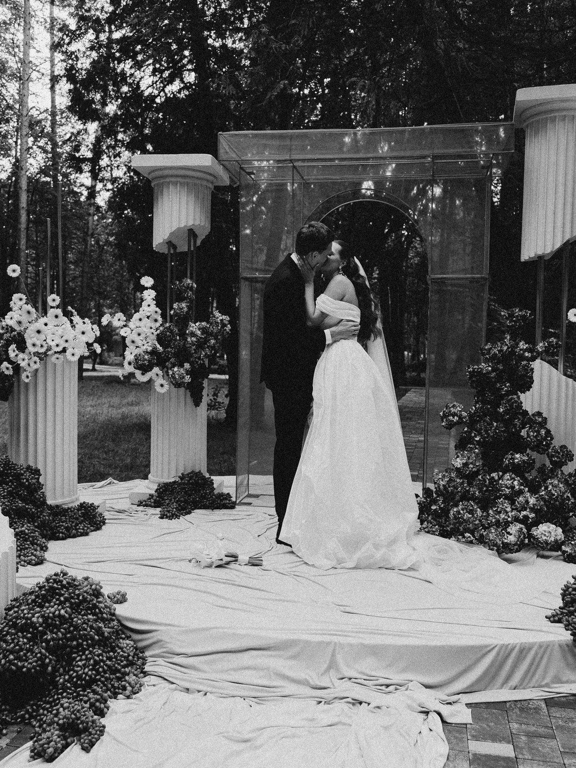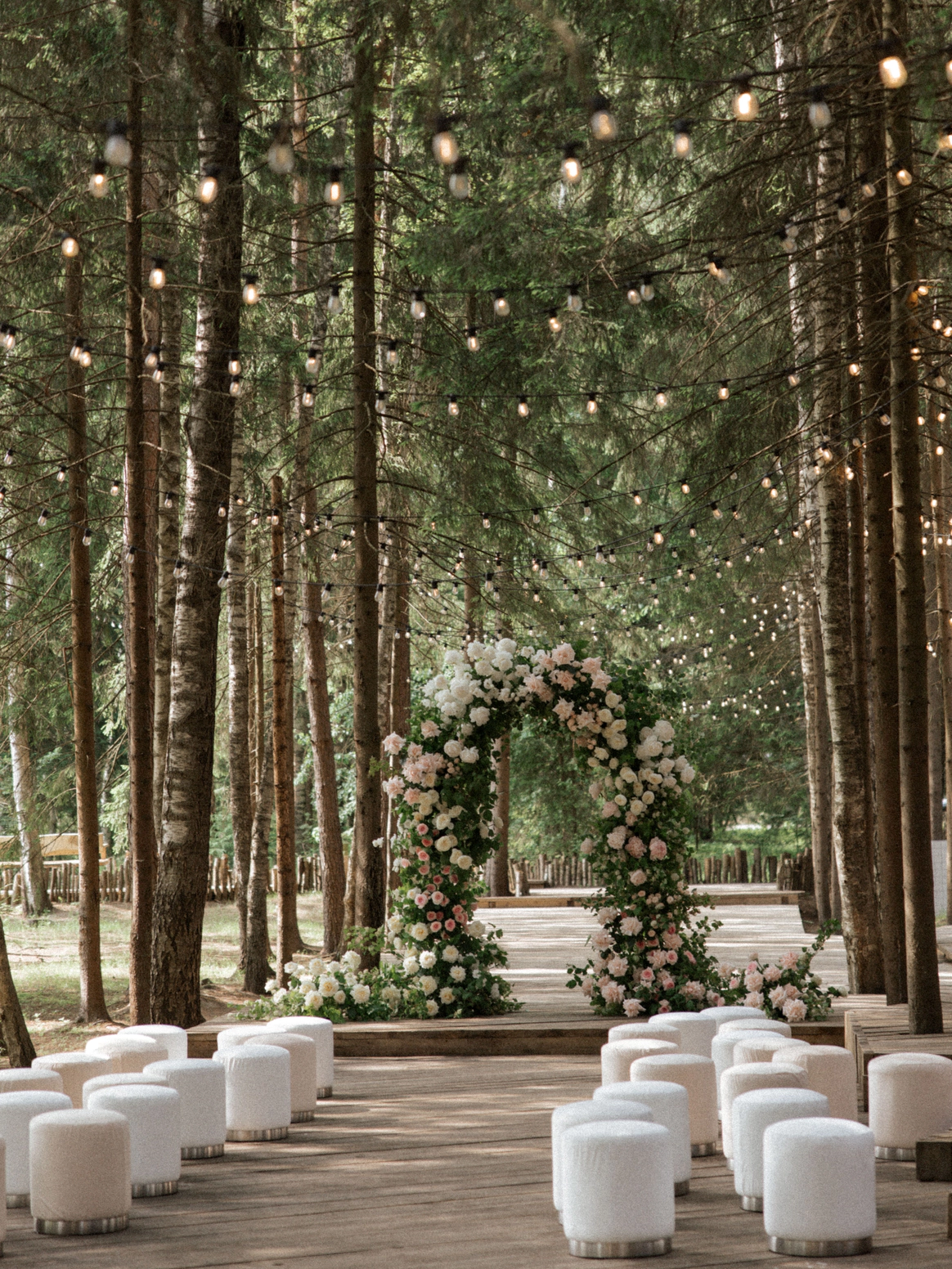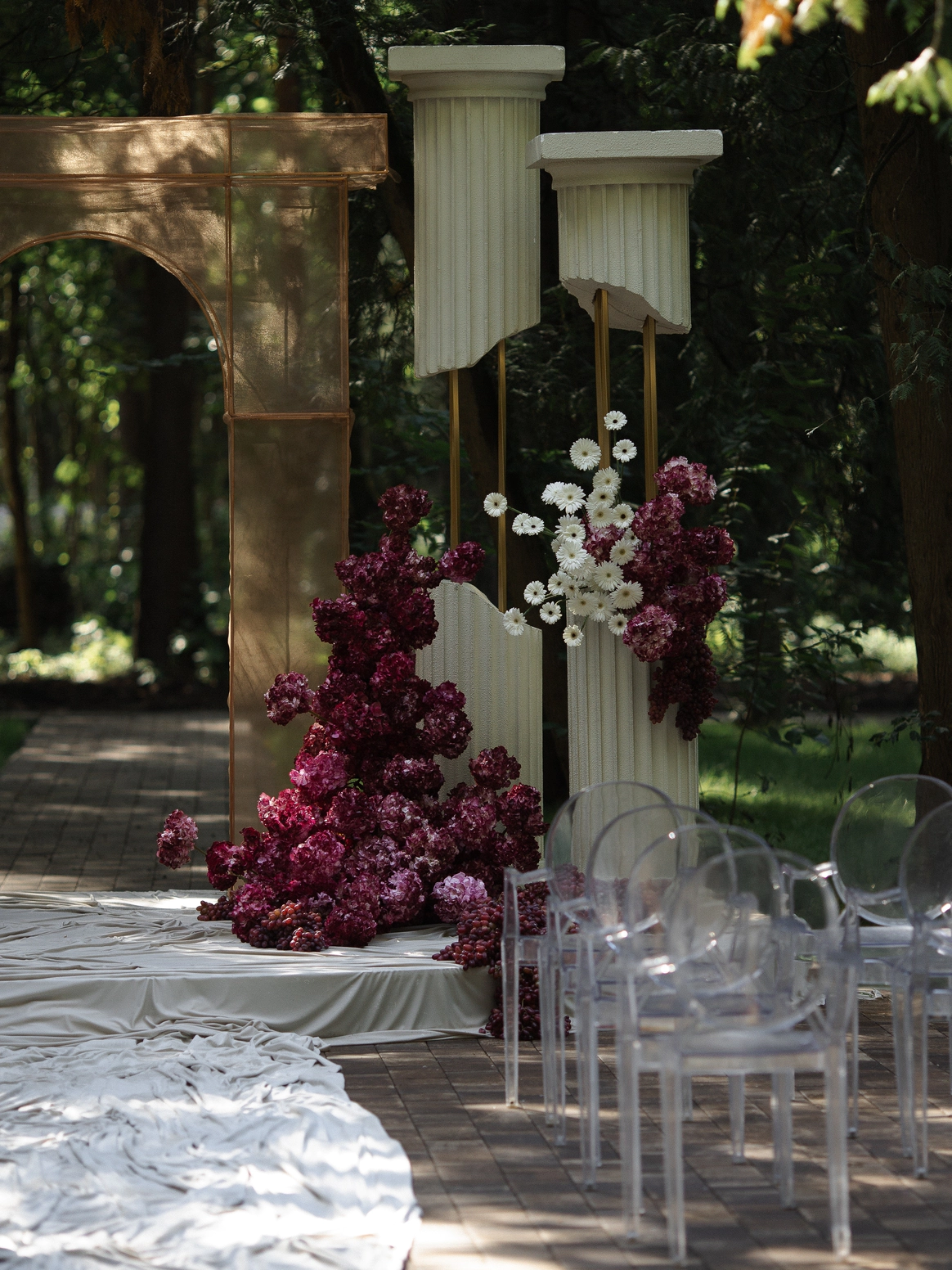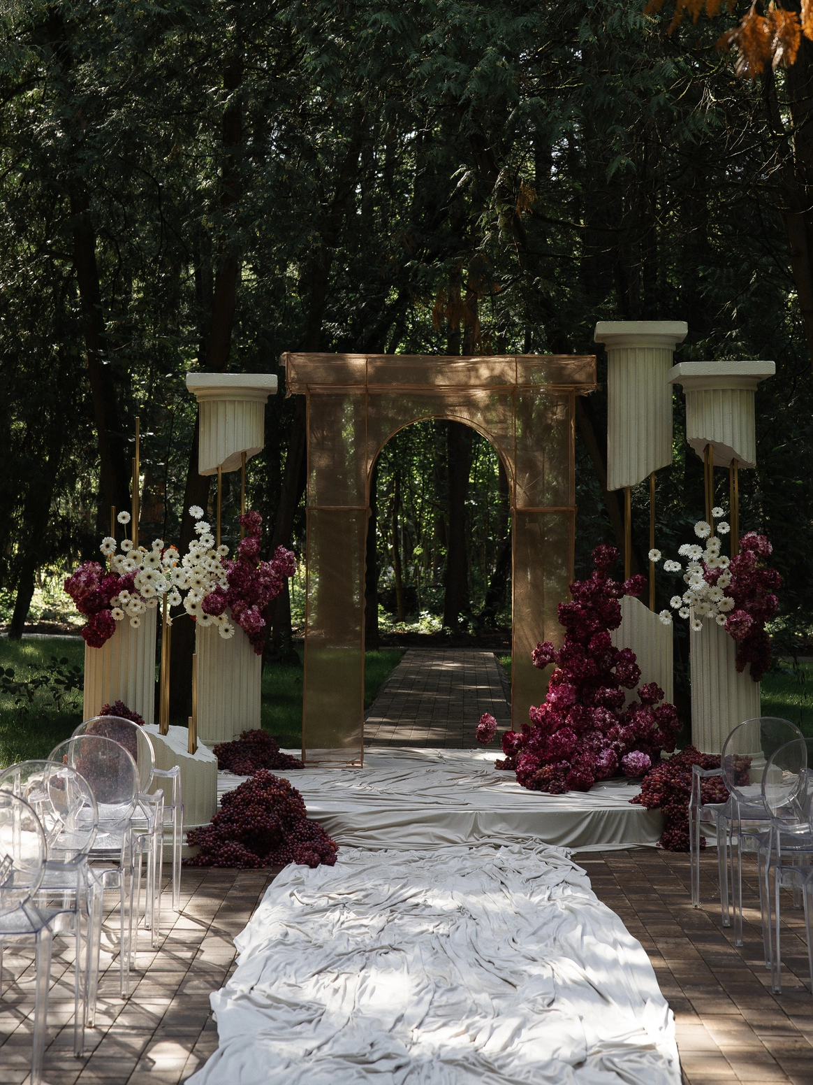Зона церемонии стала единственным пространством с активной флористикой - как визуальный акцент. Она была выполнена в стиле мечты невесты - арка из фильма “Cумерки”.