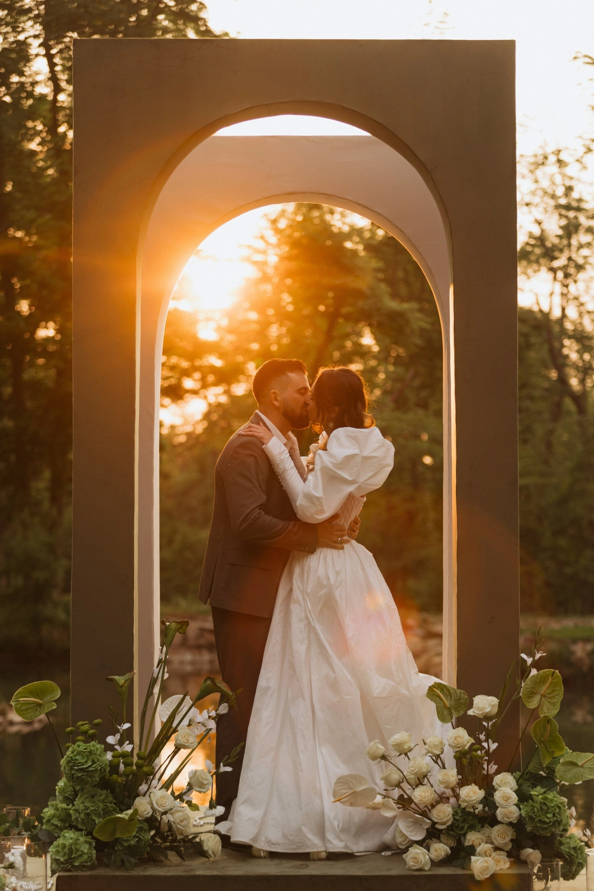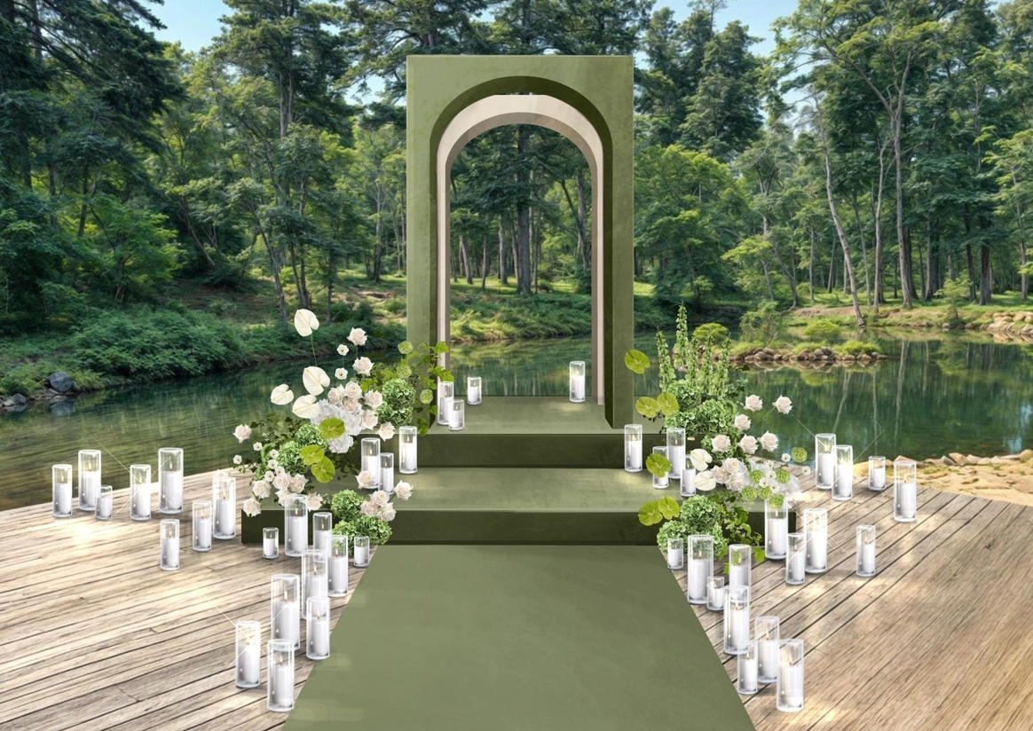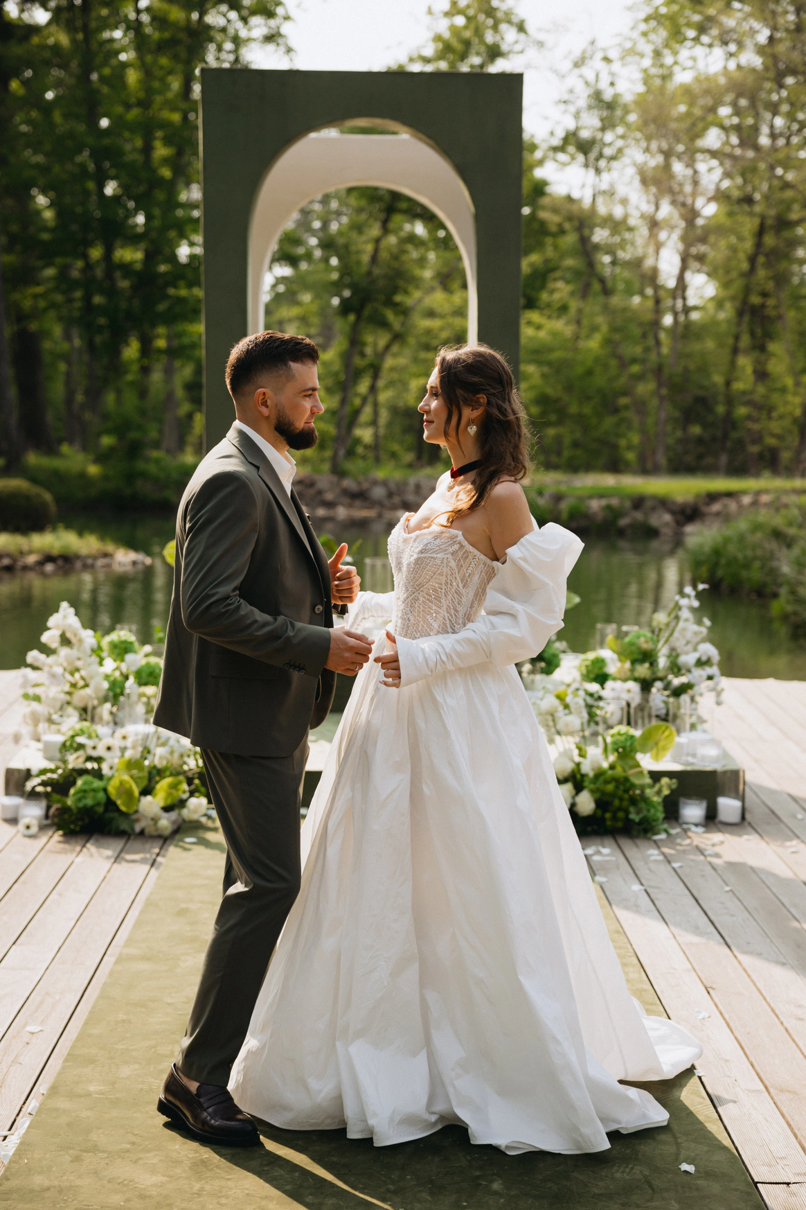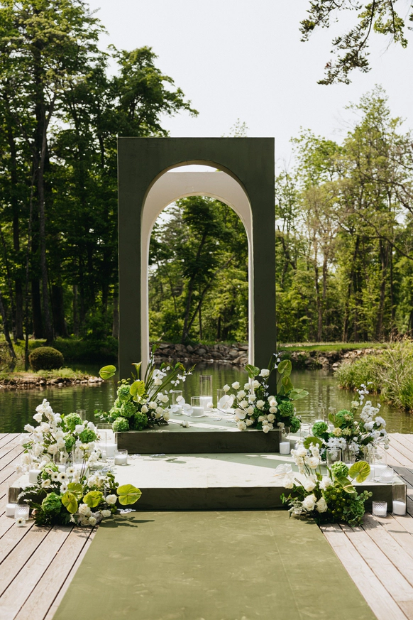 церемония проходила на пирсе озера где 2 арки стоящие друг за другом, символизировали жениха невесту. Кремовая арка - словно девушка, стоит за более высокой зеленой аркой, как невеста, которая теперь "Замужем"