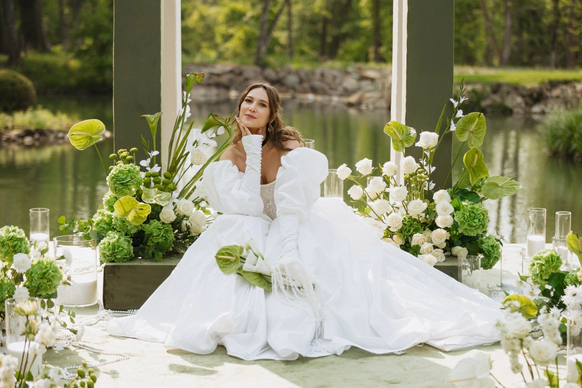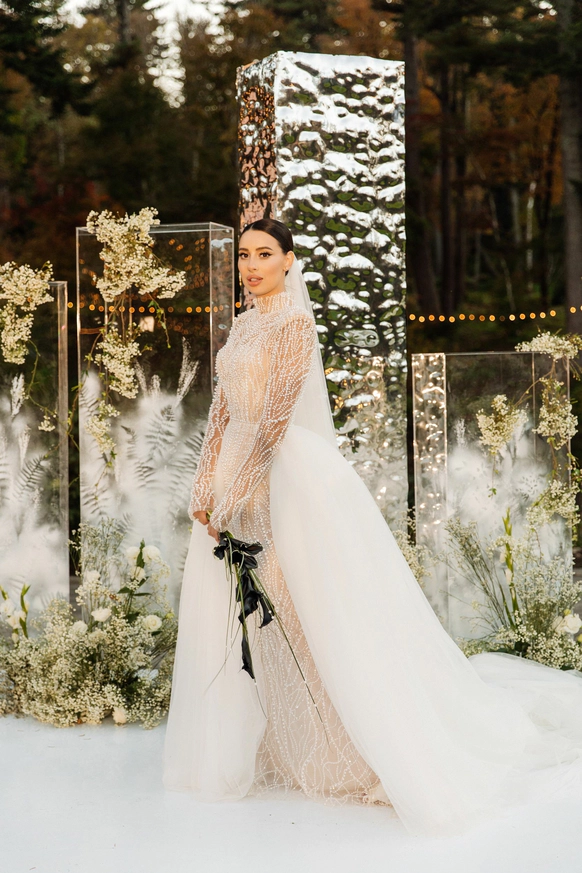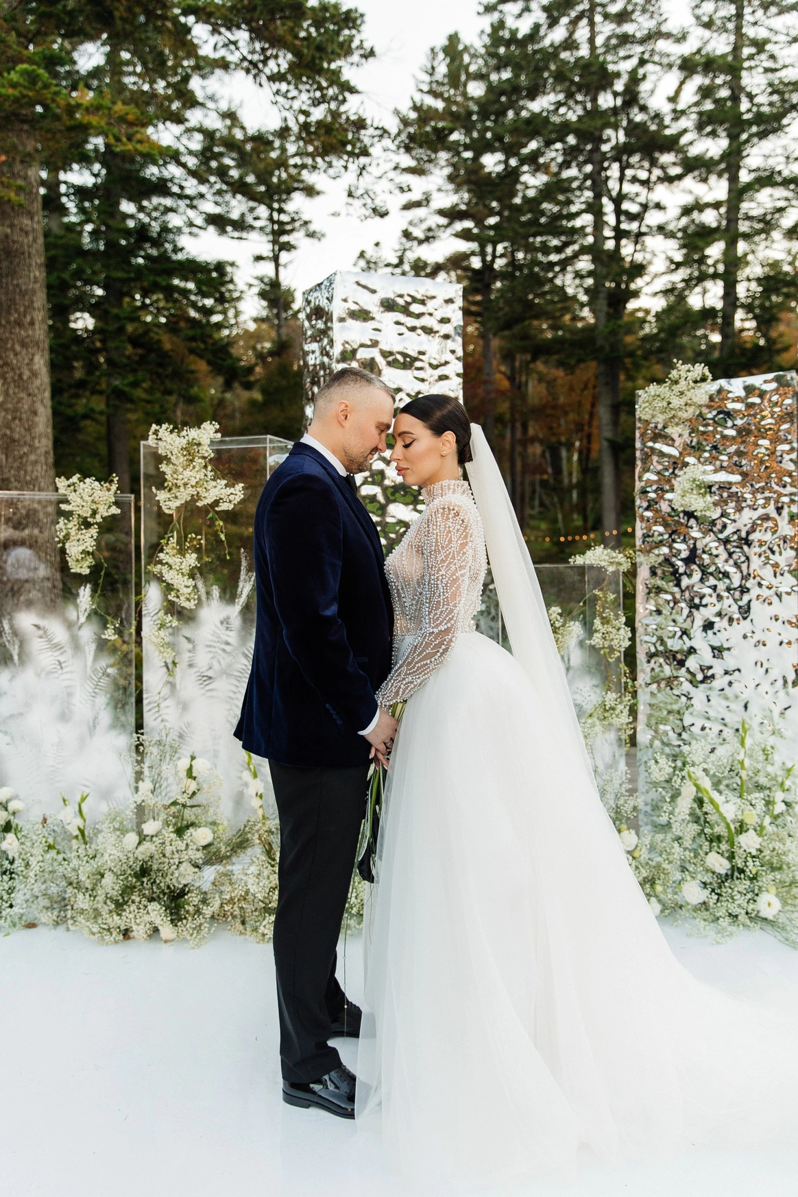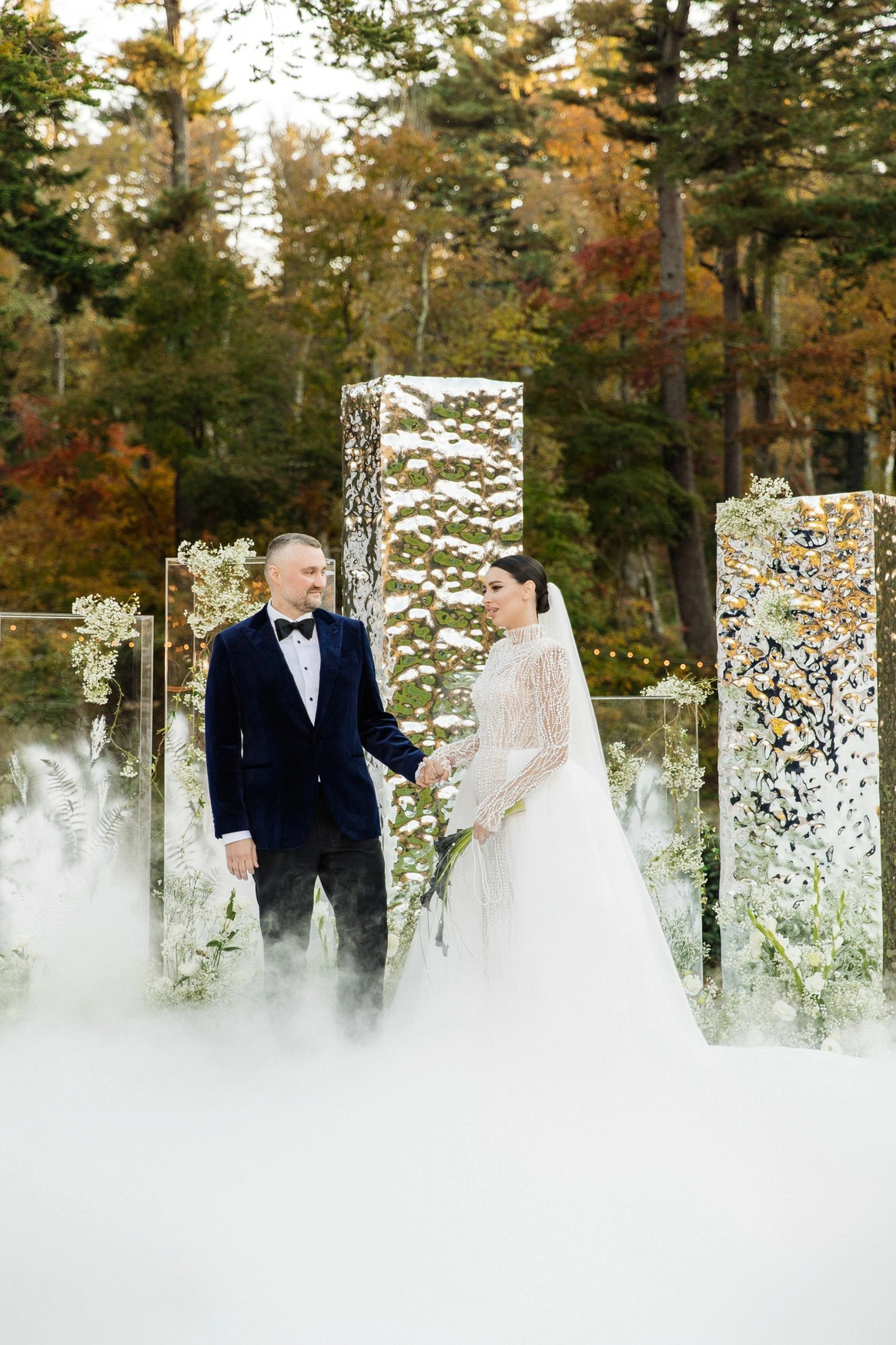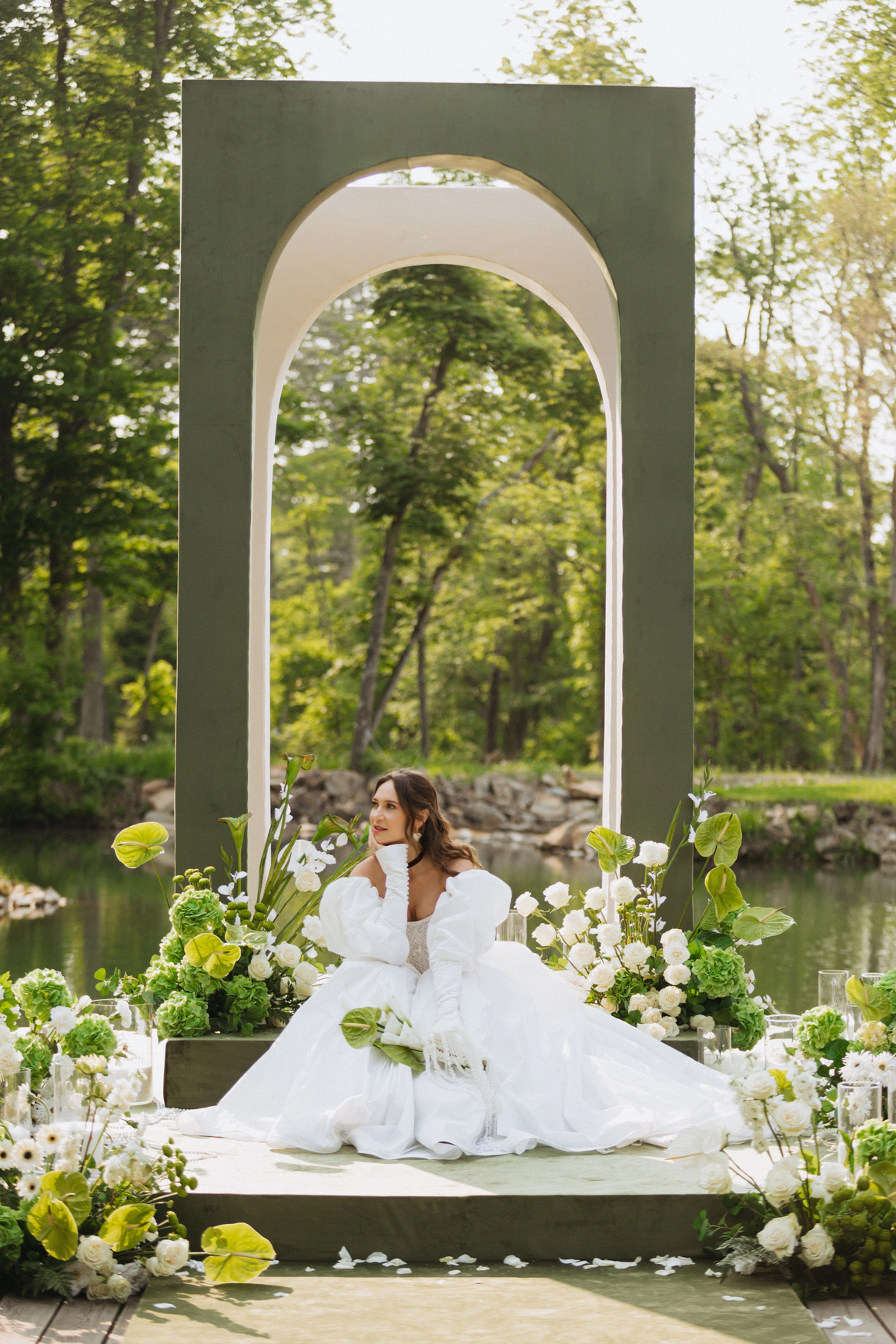 церемония проходила на пирсе озера где 2 арки стоящие друг за другом, символизировали жениха невесту. Кремовая арка - словно девушка, стоит за более высокой зеленой аркой, как невеста, которая теперь "Замужем"