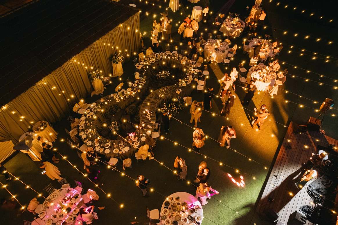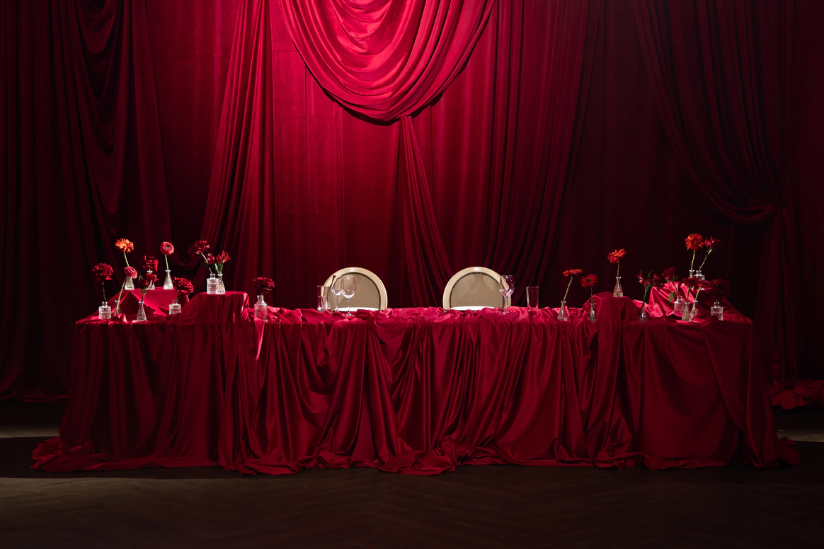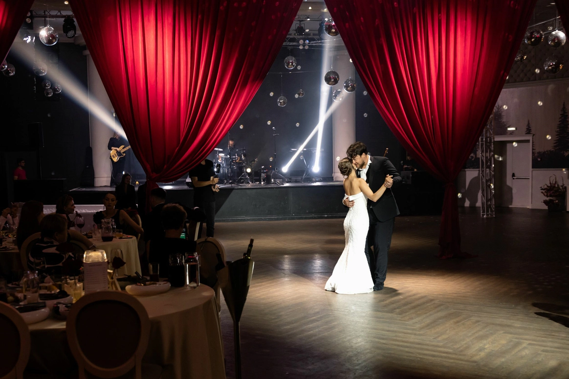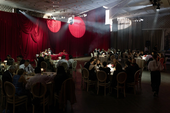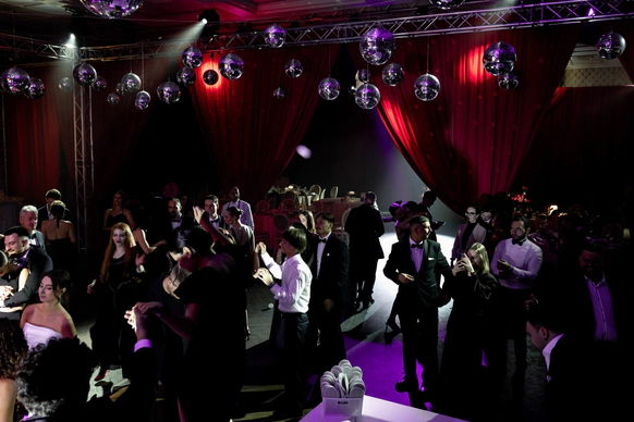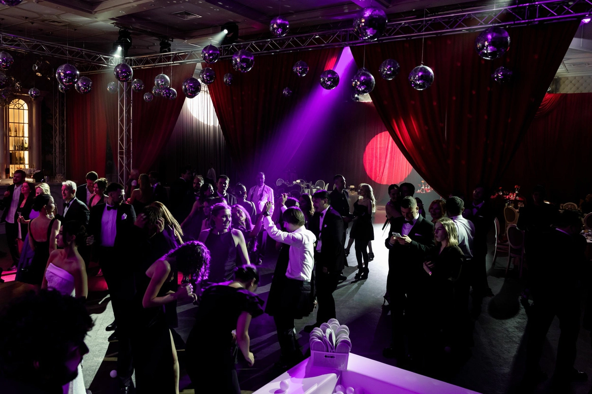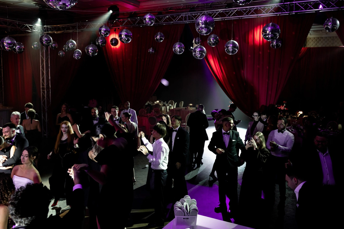 Ужин был разделен на 2 этапа- банкет с поздравлениями в формате Red Rouge Romance , а после открывался занавес и гости попадали в зону для вечеринки с музыкальной группой , шариковым бассейном , баром и диско-шарами .