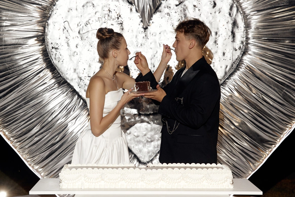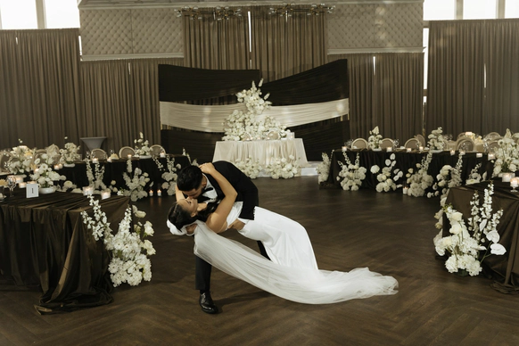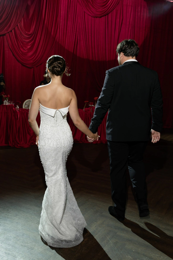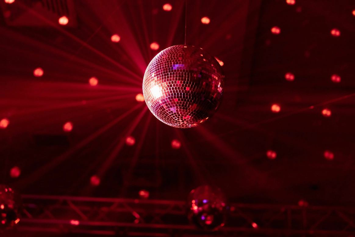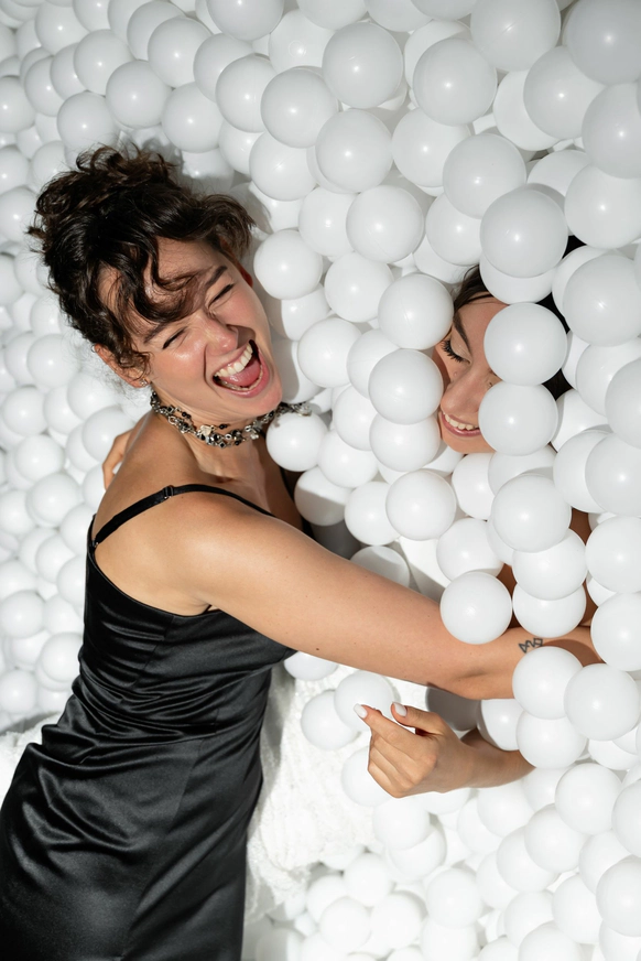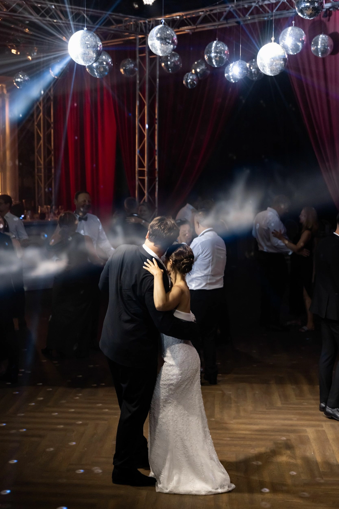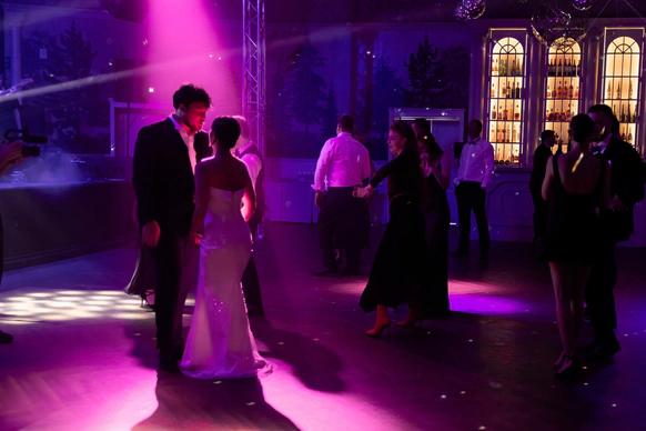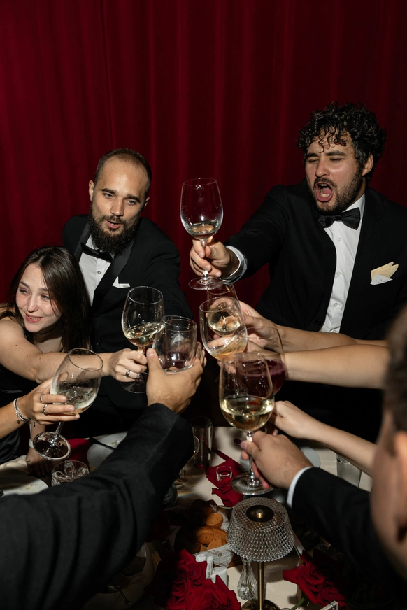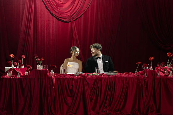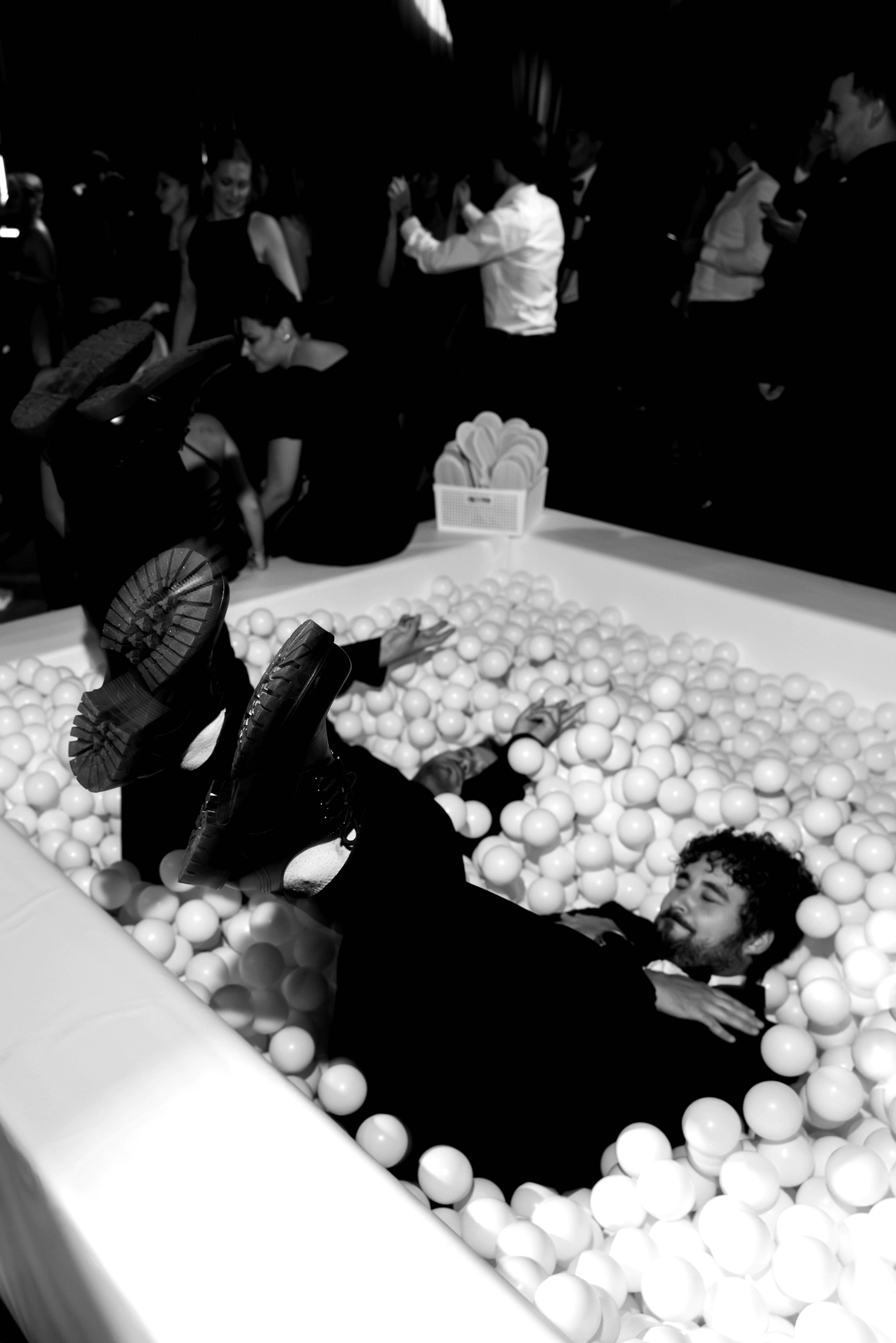 Ужин был разделен на 2 этапа- банкет с поздравлениями в формате Red Rouge Romance , а после открывался занавес и гости попадали в зону для вечеринки с музыкальной группой , шариковым бассейном , баром и диско-шарами .